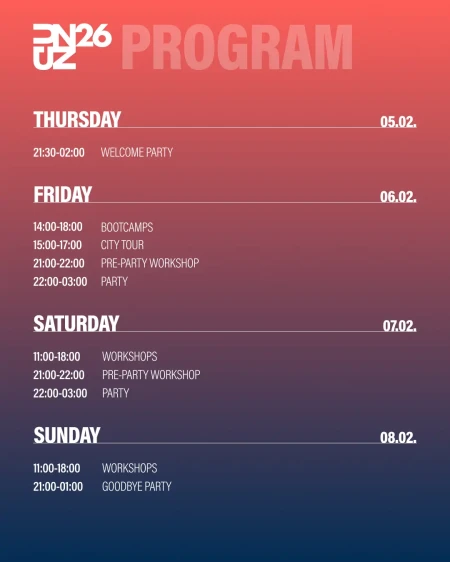 Here you will find all the information about our workshop, bootcamp, and party program. Plan your individual festival experience and get ready for an unforgettable weekend!